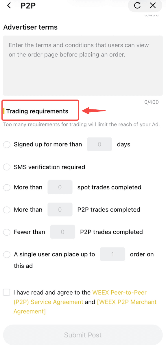 کدام کاربران میتوانند در WEEX P2P آگهی ارسال کنند؟