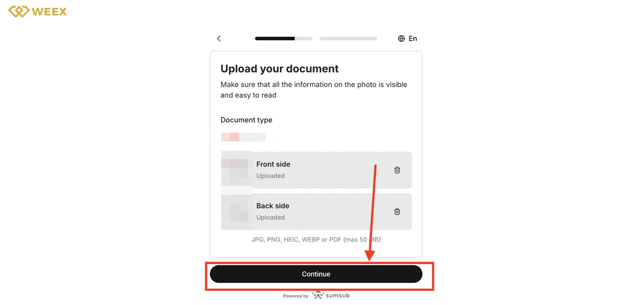 ステップ6:書類をアップロードした後、「続行」をクリックします。