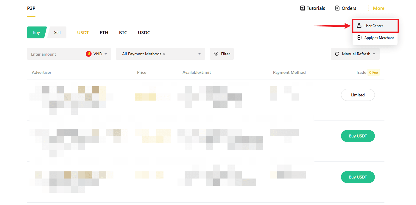 - P2Pページで「購入」タブをクリックし、購入したい暗号資産(USDT、BTCなど)を選択します。