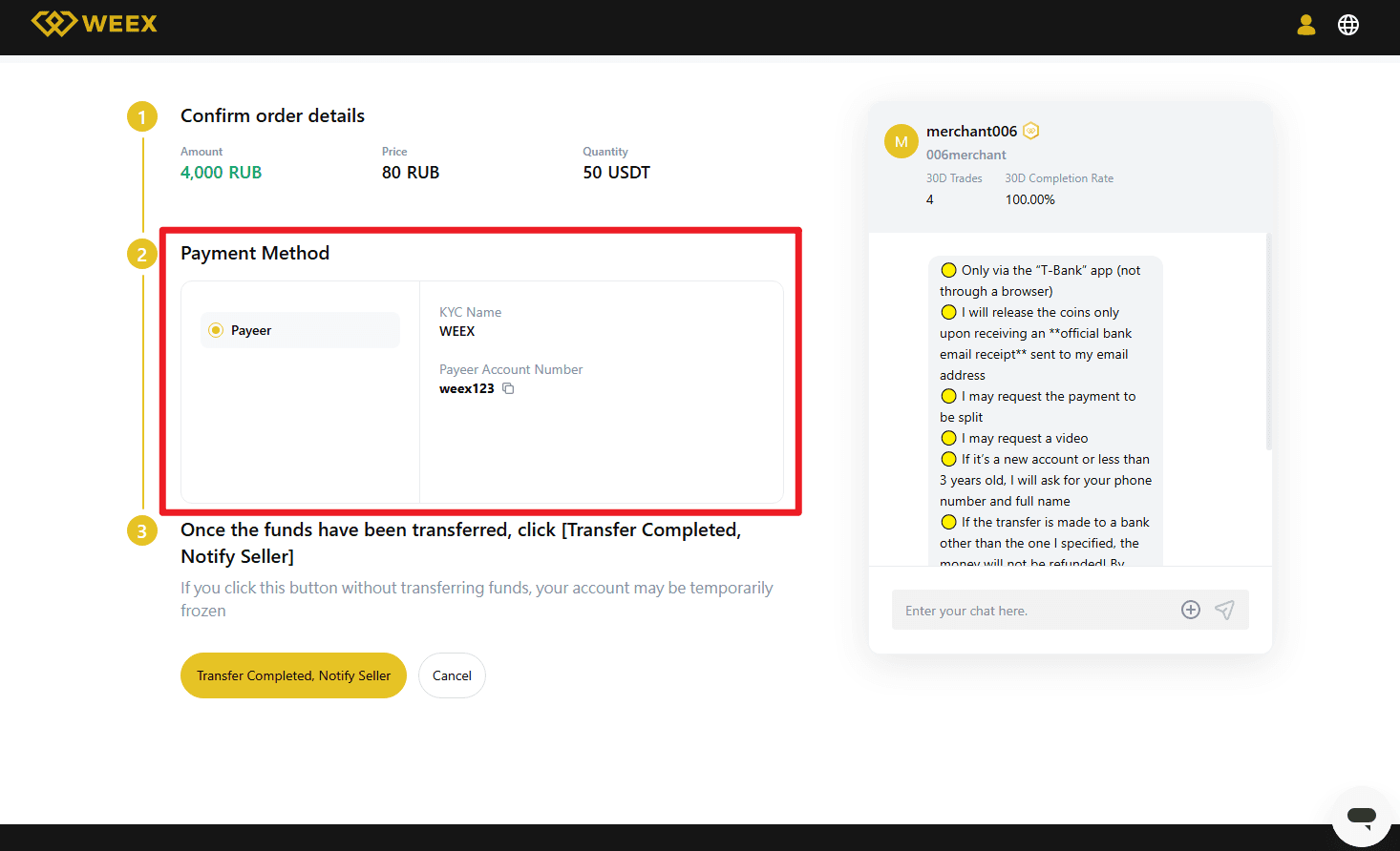 - 売り手が支払いの受領を確認すると、暗号資産がWEEXの資金アカウントにリリースされます。